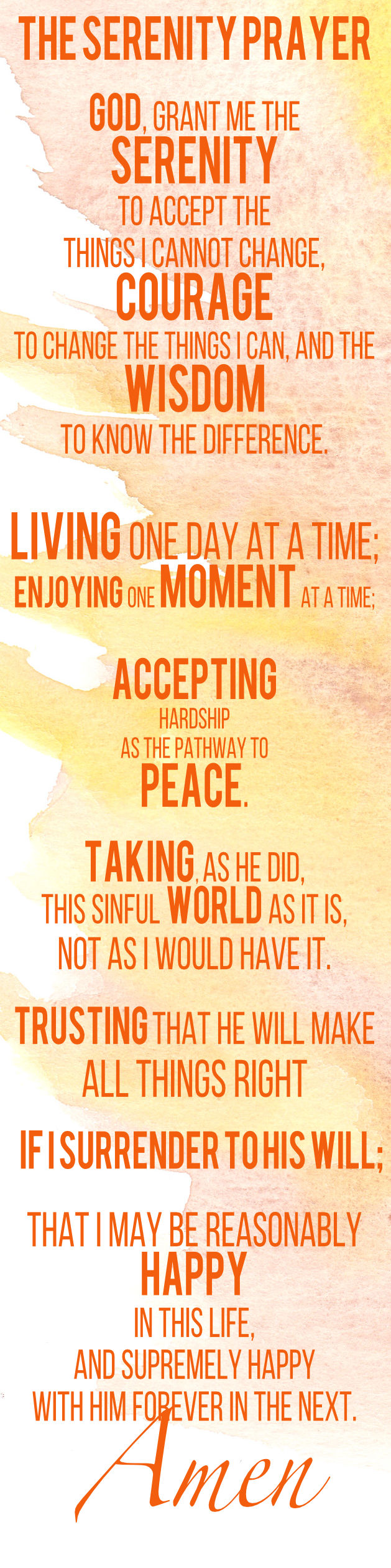 “Almighty God, our Heavenly Father, give us Serenity to accept what cannot be changed, Courage to change what should be changed, and Wisdom to know the one from the other; through Jesus Christ, our Lord.”